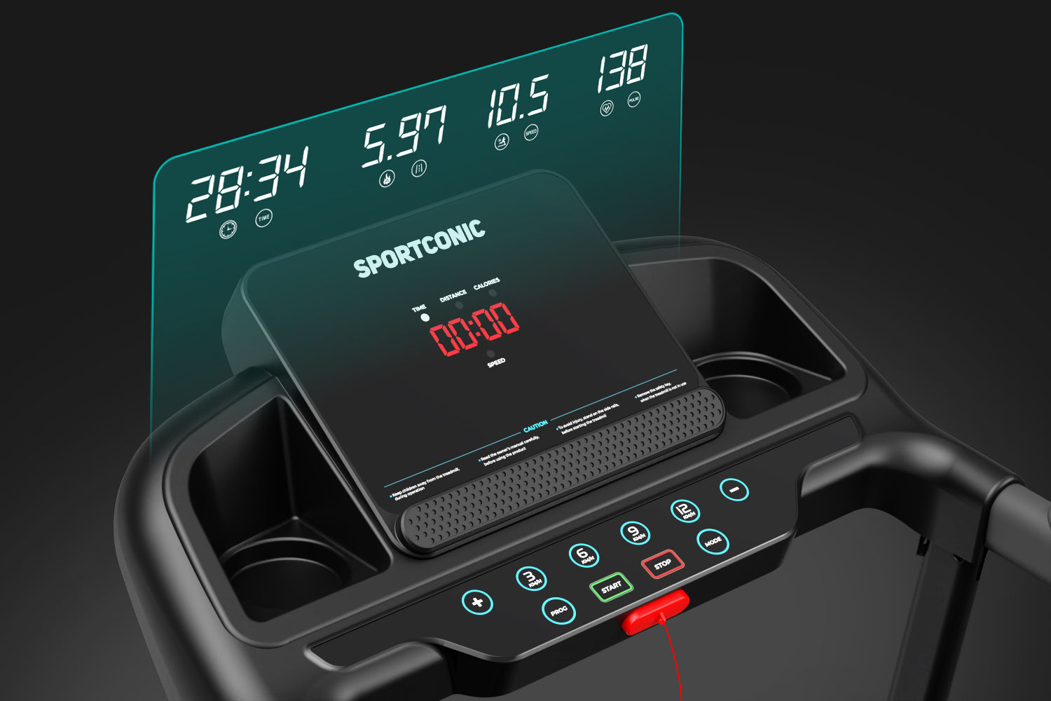 A passadeira tem um visor LED brilhante que mostra a distância, o tempo, a velocidade, o ritmo cardíaco e as calorias queimadas em tempo real.